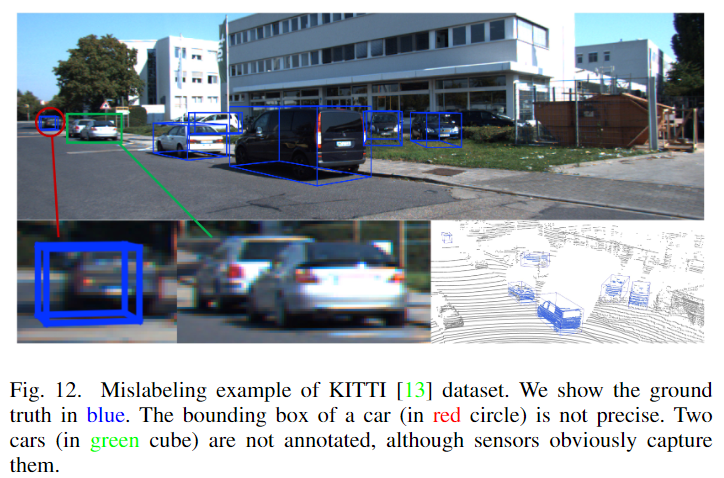 KITTI 的一个标注失败案例如下图12所示。在相应的图像和LiDAR点云中说明了真值边界框(蓝色)。在图像的左侧,汽车的标注(用红色圈出)不准确,因为它未包含整个汽车目标。此外,尽管相机和LiDAR清晰捕捉到两辆汽车(绿色长方体突出显示),但它们未被标注。