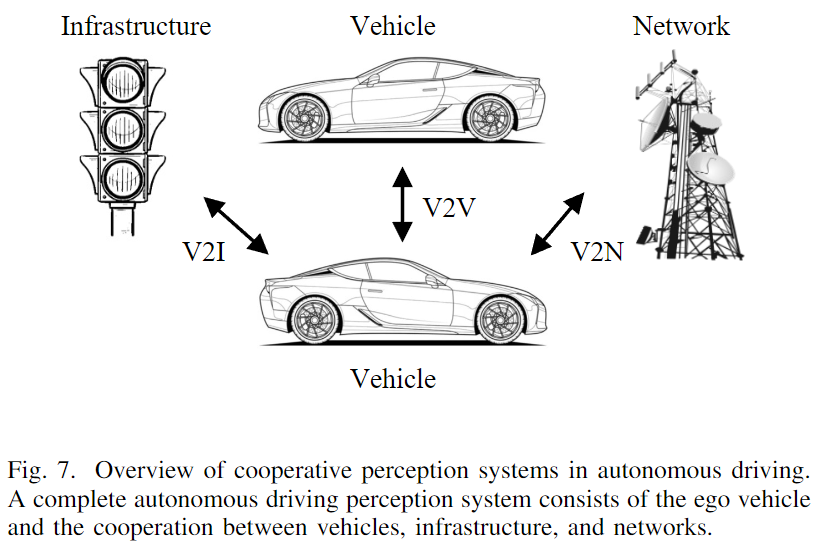 - 车到基础设施(V2I) V2I促进了自动驾驶车辆与基础设施组件之间的通信,例如交通灯、标志或路边传感器。嵌入在道路基础设施中的传感器,包括相机、LiDAR、Radar或基于事件的相机,协同工作以扩展感知范围并提高自动驾驶车辆的情境感知。在这项调查中,作者将通过基础设施或V2I进行的感知都归类为V2I。