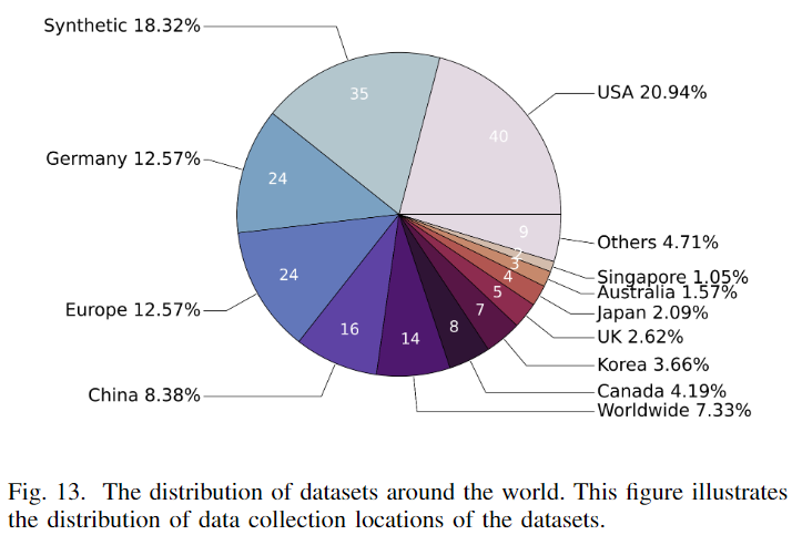 在图13中展示了191个自动驾驶数据集的全球分布概况。该图表显示美国处于领先地位,拥有40个数据集(占比21%),突显了其在自动驾驶领域的领导地位。德国拥有24个数据集,反映了其强大的汽车工业和对自动驾驶技术推动的影响。中国紧随其后,拥有16个数据集,表明中国在这一领域的兴趣和投资。另一个值得注意的点是,全球范围内有11个数据集,欧洲地区(不包括德国)有24个数据集。这种多样化的区域分布增强了收集到的数据的稳健性,并突显了研究界和工业界的国际合作和努力。