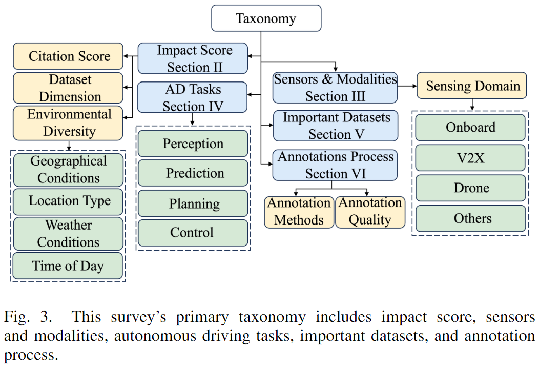 本文对200多个现有的自动驾驶数据集进行了详尽而系统的回顾和分析。从传感器类型和模态、感知领域以及与自动驾驶数据集相关的任务开始。引入了一个称为"影响分数"的新型评估指标,以验证感知数据集的影响力和重要性。随后,展示了几个高影响力数据集,涉及感知、预测、规划、控制和端到端自动驾驶。此外,解释了自动驾驶数据集的标注方法,并调查了影响标注质量的因素。