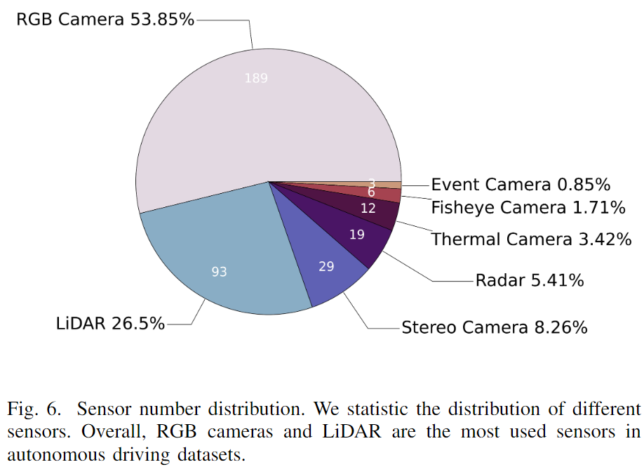 作者从收集的数据集中分析传感器的分布,如下图 6 所示。超过一半的传感器是单目相机(53.85%),这是因为它们价格低廉且性能可靠。此外,93 个数据集包含 LiDAR 数据,由于其高分辨率和精确的空间信息而受到重视。然而,由于高昂的成本,限制了 LiDAR 的广泛使用。除 LiDAR 点云外,29 个数据集利用双目相机捕捉深度信息。此外,分别包含Radar、热像相机和鱼眼相机的数据集比例分别为5.41%、3.42%和1.71%。考虑到以事件为基础的相机捕捉动态场景的时间效率,有三个数据集生成基于事件的相机数据。