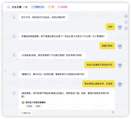 当然还可以设置角色的背景,来自哪里,师从何派,有哪些口头禅等等。这里就不一一赘述,总之可以对人物进行详细的描述,其目的就是让人物的性格更加丰满。在完成基本设置之后,我就开始与这位虚拟大侠进行“对话”了。