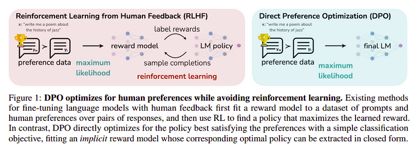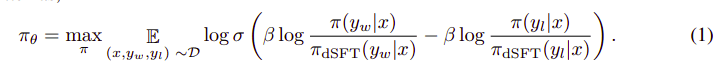最后这一步的目标是最大化模型的偏好,偏向yw(最高评分完成)而非yl(低评分完成)。这是使用DPO(直接偏好优化)来完成的。使用DPO比使用普通RLHF来得简单,直观上性能优于RLHF。本例中的方法被之所以称为dDPO,是由于它使用借助教师模型生成的蒸馏数据集。