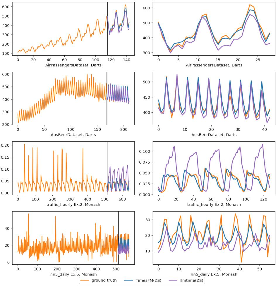 图 6:在 Darts 和 Monash 数据集上的推理可视化。右侧的图放大了左侧的预测部分。