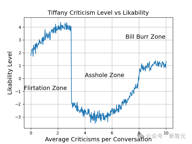 目前,Chad-GPT正好运行在这个区间,它一直非常小心地让自己对女友的批评轻松有趣,避免踏入让女友不悦的「刻薄区」(3-8CpC)。