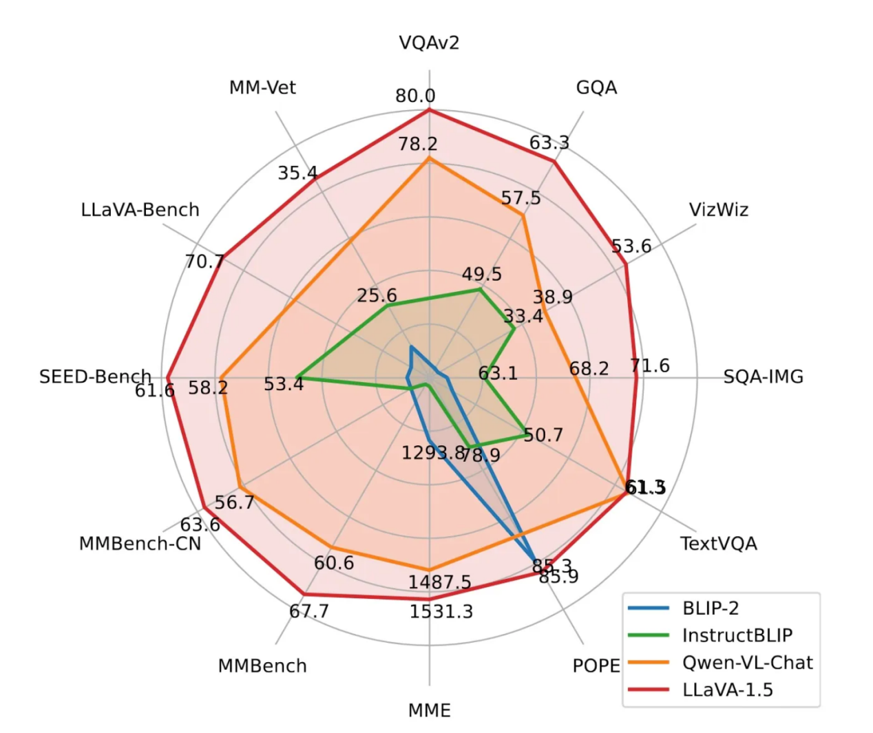 LLaVA基准结果雷达图(图片来自论文https://arxiv.org/pdf/2304.08485.pdf)