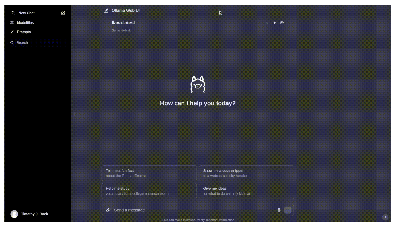 LLaVA也可以借助于Ollama(https://ollama.ai/)或Mozilla的“llamafile”(https://github.com/Mozilla-Ocho/llamafile)安装在本地机器上。这些工具可以在大多数仅使用CPU的消费级机器上运行,因为该模型只需要8GB的RAM和4GB的可用磁盘空间,甚至可以在Raspberry PI上成功运行。在围绕Ollama项目开发的工具和界面中,一个值得注意的办法是Ollama WebUI(https://github.com/ollama-webui/ollama-webui,如下图所示),它再现了OpenAI ChatGPT用户界面的外观。
