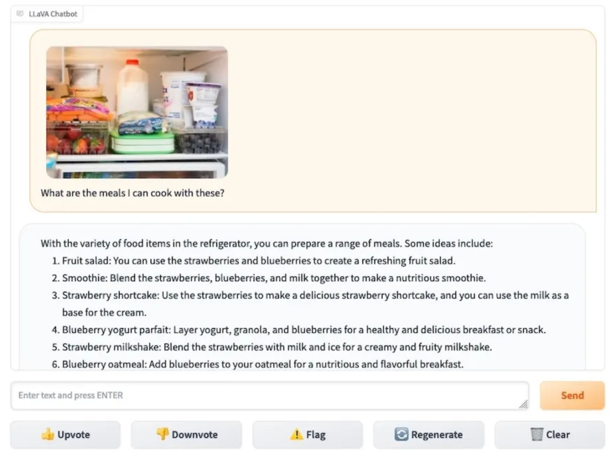 如果您还没有尝试过,那么使用LLaVA最简单的方法是转到其作者提供的Web界面(https://llava.hliu.cc/)。下面的屏幕截图展示了该界面的操作方式,用户在给出冰箱内容图片的情况下,询问该怎么吃。你可以使用界面中左侧的小部件加载图像,聊天界面允许以文本的形式提问和获得答案。