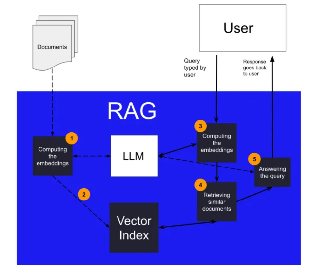 在执行查询时,使用LLM对查询进行向量化(3)。然后在向量索引中查询得到的向量,以检索最相似的文档(4)。然后,使用提示工程将这些文档用于回答查询(5)。