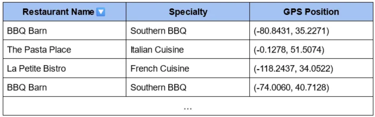 想象一下,现在你有一张表格,上面有GPS位置,代表每个餐厅的确切纬度和经度: