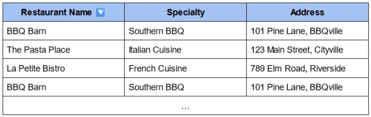 比方说,你终于在爱丽丝家找到了她,现在你想找点吃的。你可能想找最近的餐馆。于是,你查找一份餐馆列表,最后得到一张餐馆、特色菜和地址的表格。让我们来看看您可以找到的信息: