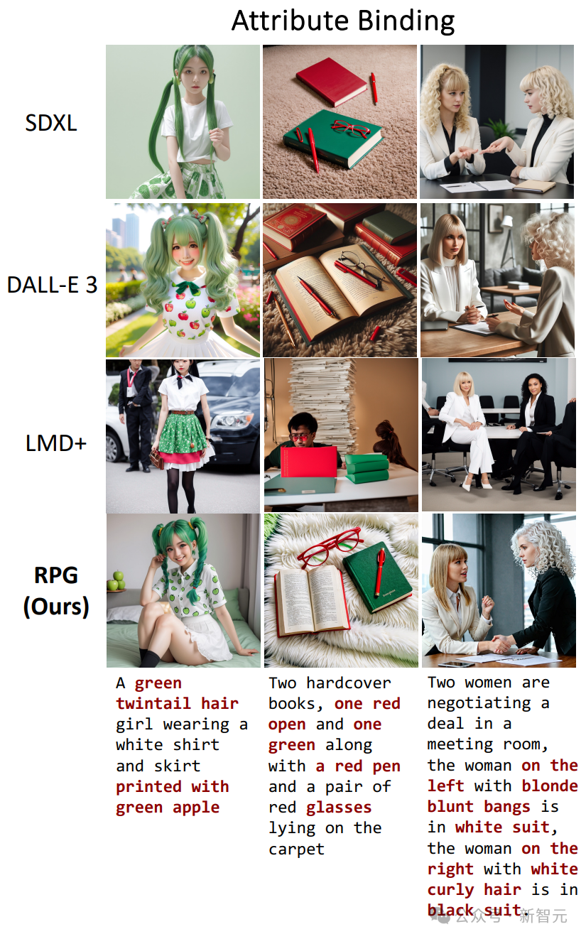 我们来看一下生成效果在以上三个方面的表现,首先是属性绑定,对比SDXL、DALL·E 3和LMD+: