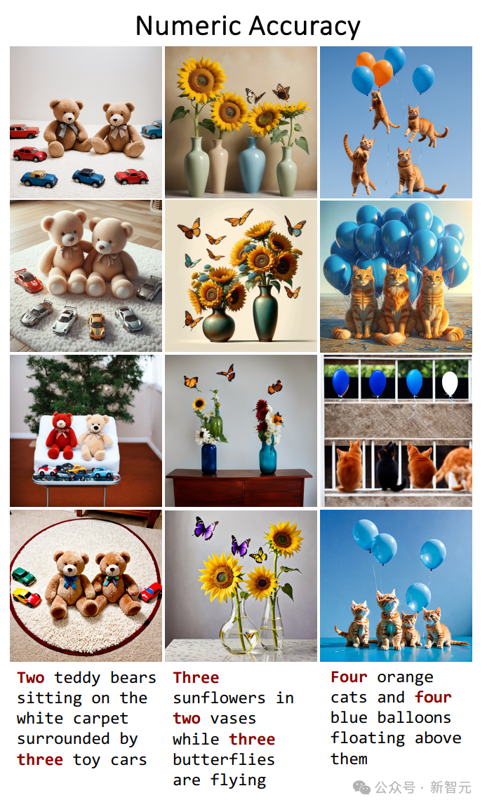 然后是数值准确性,展示顺序同上(SDXL、DALL·E 3、LMD+、RPG):