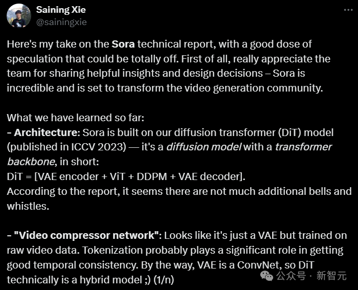 AI大神谢赛宁,针对Sora的技术报告谈了自己的看法。