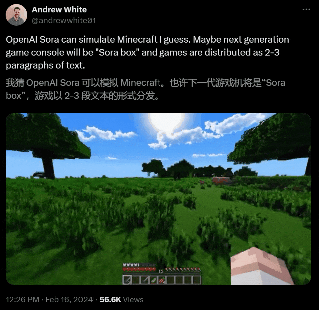 通过底层训练和patch,Sora能够理解和开发近乎完美的视觉模拟,比如Minecraft这样的数字世界。这样,它就会为未来的AI创造出训练内容。有了数据和系统,AI就能更好地理解世界。