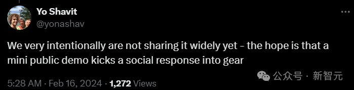 一位OpenAI员工发推表示,现在Sora只会在有限的范围内试用,现在放出的demo主要是为了获得社会大众对它能力的反应