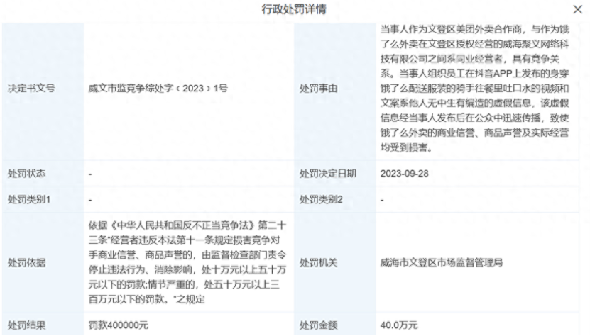近日,美团合作方临沂美尊建材有限公司第二分公司(下称“美尊建材第二分公司”)因损害竞争对手商业信誉,被威海市文登区市场监督管理局罚款40万元,处罚决定文书号为“威文市监竞争综处字〔2023〕1号”。
