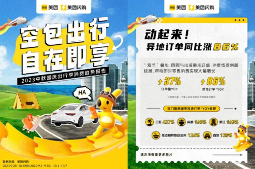 贝多财经发现,美团抓住了即时零售便利性的特征,并提出了“异地订单”这一契合年轻群体出行简装需求的概念。根据美团闪购发布的《2023中秋国庆出行季消费趋势报告》,今年国庆中秋双节的异地订单同比增长86%。