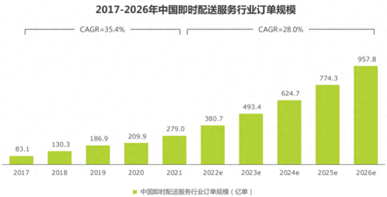 而随着即时配送服务行业向全场景、全距离、全时段方向发展,并加速成为本地消费的基础服务设施,艾瑞咨询预计2026年即时配送服务行业订单规模将接近千亿量级,达到957.8亿单,2021年至2026年年复合增速为28.0%。