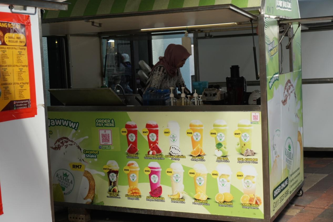 霞光社探访途中,在当地一家蜜雪店门外,就有一家大马本地人开的水果茶小摊,售卖果茶奶昔,售价基本设定也在6-7马币左右。除去冰激凌和柠檬水这两款经典蜜雪“走量”低价品类外,其他饮品相对来看与当地本土饮品价格差异不大。