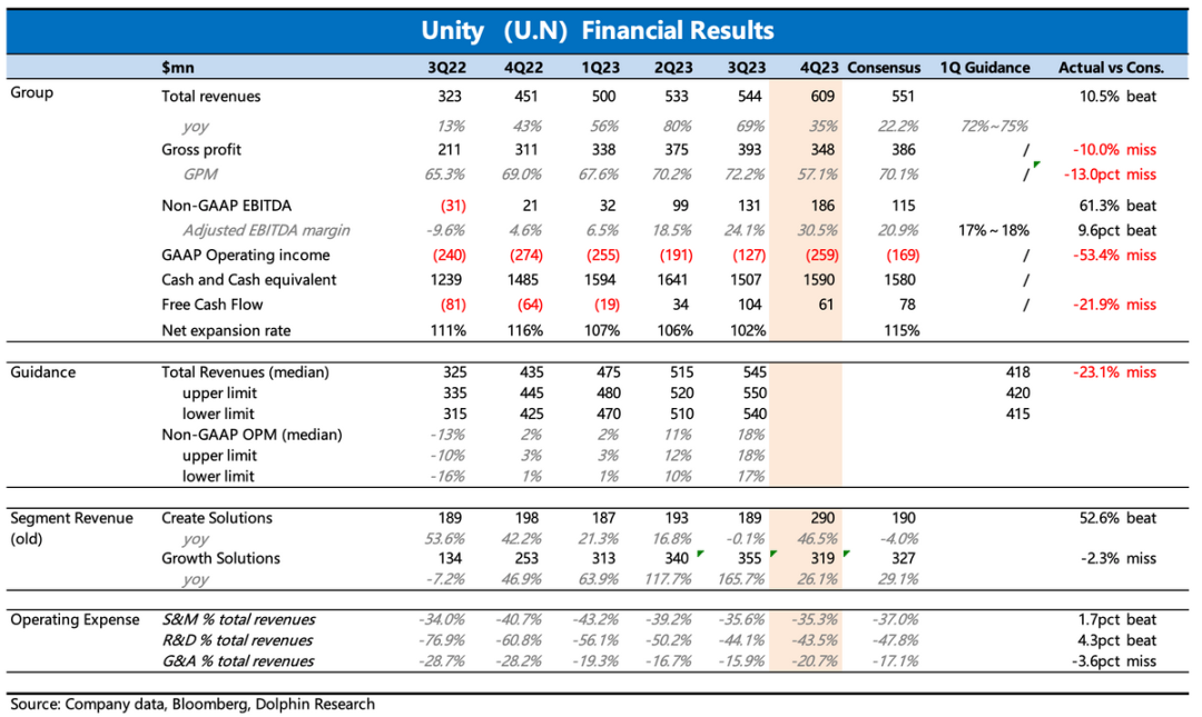 因此这种情况下,Q4业绩对指引公司何时走出重组阴霾就显得至关重要,但实际来看,由于一些披露结构的变化加上部分前瞻性指标未在快报中呈现,因此使得短期前景的判断更加困难。公司预计一季度末完成重组,届时可能才能摸清Unity的基本面拐点。