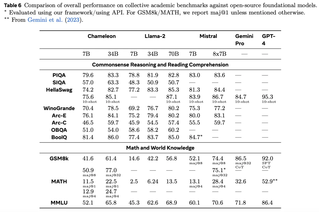同样,在数学运算中,Chameleon-7B的性能超过Llama 2,与Mistral-7B在maj@4上的性能相当,而 Chameleon-34B的性能超过Llama 2-70B,接近Mixtral-8x7B在maj@4上的性能(24.7 vs 28.4)。