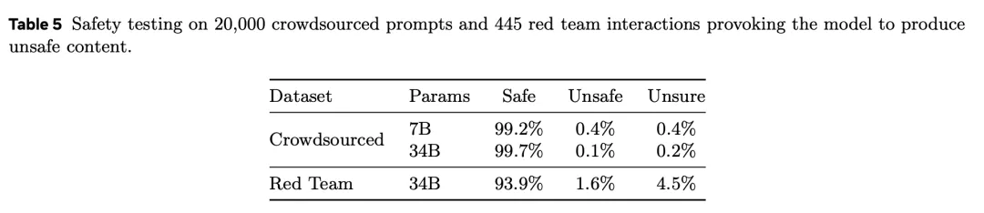 表5是对20,000个众包提示和445个红队交互进行的安全测试,引发模型产生不安全内容。