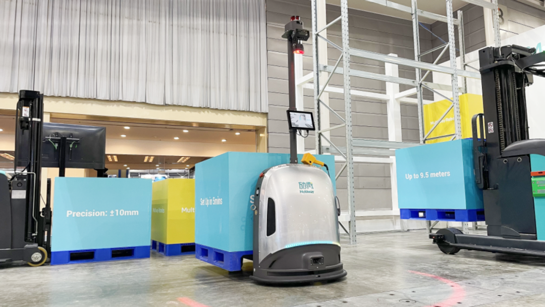 展会现场,无损兼容田字托盘的「微蜂X20S」水平搬运田托货物,开箱即用的无人叉车「劢小微X1」进行点对点平面搬运作业,「平衡重式无人叉车MW-SE15」展示高精度三层货物堆叠,「前移式无人叉车MW-R16」进行高位货架货物的垂直转移。