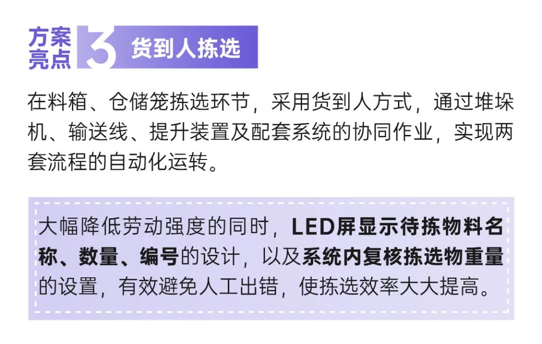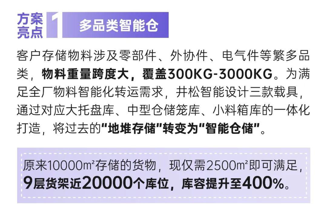 为化解以上难题,企业联手整厂智能方案提供商井松智能,针对5W多种SKU物料的智能化存储、拣选、流转与信息化管理需求,投入整套智能软硬件设备系统。井松智能采用大托盘、中型仓储笼、小型料箱集中立体存储的设计,结合多设备与新功能的联用,促使库容量提升数倍,实现数万种零部组件的自动存储与收发,大大提高齐套拣选与厂内物流效率。