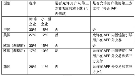 其他国家都出台了针对“苹果税”的相关法案,但目前来看,国内尚未出台类似的规定,这反倒让中国成为全球范围内“苹果税”最高的国家,苹果向中国市场标准企业、中小开发者征收的“苹果税”分别为30%、15%。而且,苹果在中国不允许App外交易或第三方支付。