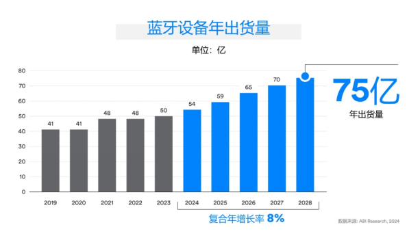 此前,SIG 发布的《2024年蓝牙市场最新资讯》显示,预计到 2028 年,蓝牙设备的年出货量将达到 75 亿台,五年复合年增长率(CAGR)为 8%。