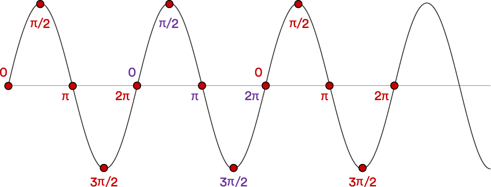 PBR 方法利用了无线电信号的一个基本特性,即相位及其与频率和波长的关系。相位可视为波周期的一部分,通常用 0 至 2π 弧度之间的角度表示。相位的变化有时归因于相位旋转。下图显示了无线电信号中对应于不同点的示例相位值,注意到这些值在多个波周期中具有周期性和重复性。