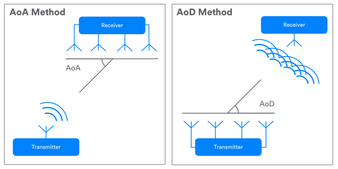 AoD的原理相同,也是利用信号相位差从而计算角度。只不过是将发射器和接收器的角色进行了交换,发射器有多个天线,而接收器是单天线的,接收器使用角度相对发射器的位置就像迎角一样,可以通过接收到的信号计算出来波的方向,进而定位。
