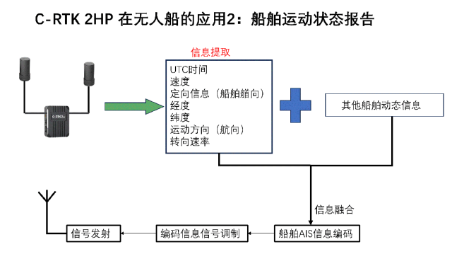 通过软件无线电技术,C-RTK 2HP 可以将解析出的无人船动态、静态数据与其他船舶信息进行融合,并通过无线电传输,实现与周围船舶的信息交换,提高了无人船的通信能力和航行安全。