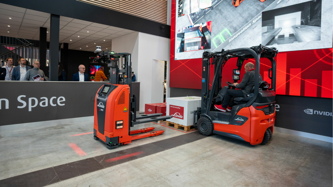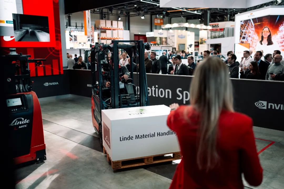 在LogiMAT展会上,凯傲集团旗下品牌林德物料搬运展示了一套完全集成的货物入库解决方案,包括一台自主移动机器人(AMR)和一辆手动叉车,两者均采用人工智能技术。该解决方案在英伟达的Omniverse中以数字化形式呈现,可显示叉车的实时定位。车载和固定摄像头在英伟达硬件上运行,可捕捉和处理实时操作数据。整个解决方案在不断发展变化的模拟环境中运行,为大规模优化车辆协调和路线规划做好准备。此外,叉车还具备应用程序功能,能够持续升级软件,增强人员识别和避障等功能。