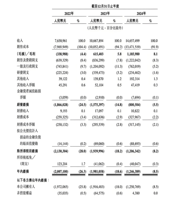 根据曹操出行招股书,其在2022-2024年的营收分别为76.31亿元、106.68亿元、146.57亿元;净亏损分别为20.07亿元、19.81亿元、12.46亿元。虽然毛利率已开始逐渐转正,但依然没能跳出亏损泥潭,过去三年累计亏损超50亿元,总累计亏损超130亿元。