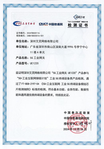 近日,深圳艾灵网络有限公司自主研发的UE1220工业5G网关顺利通过第一批“5G+工业互联网”铸链计划产品测试,测试内容涵盖5G NR基本功能、业务性能、数据性能和通信类终端功能等方面。