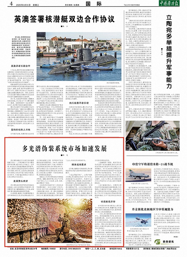 一方面,多光谱伪装系统市场空间扩大。多国加强该技术研发、加大相关装备采购力度。2024年,法国订购3000套多光谱伪装系统。今年2月,丹麦宣布为CV90步战车加装移动式多光谱伪装系统。同时,多光谱伪装系统逐步向模块化、轻量化和定制化发展,更便于战场使用和维护。