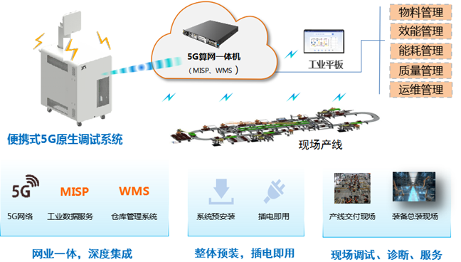 5G原生产线调试系统,作为服务产线的轻量化便携工具,基于UniEngine算网一体机预集成5G网络和明珞MISP(工业物联网智能制造服务平台),实现云网业一体化部署,OICT深度融合。项目现场开机即用,实现5G网络和产线应用同步上线,减少网络和应用系统部署成本和时间,缩短产线交付、调试和量产周期,提高产线服务效率。