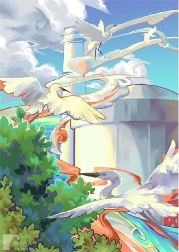 孟芮妍作品,描绘了栖息在中国大陆第一座核电站——秦山核电站的白鹭和秦山核电站的外观