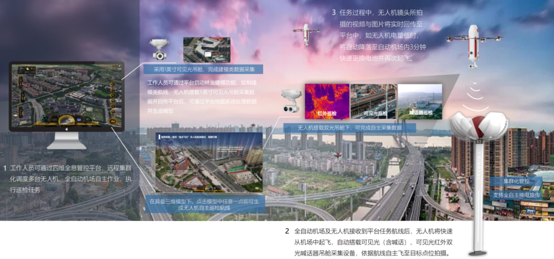 无人机作为近年来新型发展技术,已经开始与城市安防建设融合,但是,在传统的人工操作下,无人机受到主观因素的影响,飞行不稳定,安全性低,且续航能力弱,有效巡防时间短,不能大规模投入使用。云圣智能通过深度结合数字孪生、人工智能算法、物联网和5G端边云融合等核心技术,融合城市已有智能资源,打造了“空天地一体化”无人值守安防巡检系统,用全自动化、智能化的巡检模式,实现对城市安防建设的数字化升级和智慧化监管。