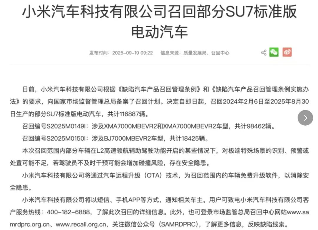 小米汽车科技有限公司根据《缺陷汽车产品召回管理条例》和《缺陷汽车产品召回管理条例实施办法》的要求,向国家市场监督管理总局备案了召回计划。决定自即日起,召回2024年2月6日至2025年8月30日生产的部分SU7标准版电动汽车,共计11.69万辆。