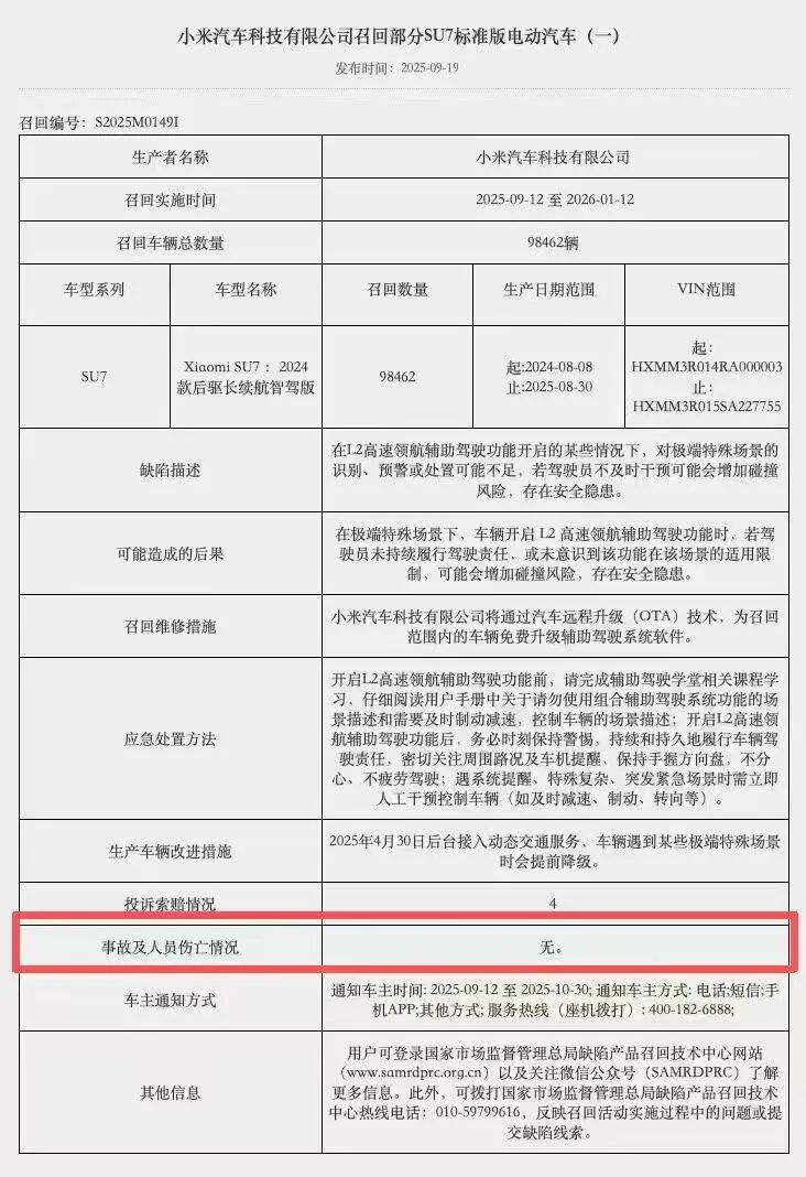 根据《缺陷汽车产品召回管理条例》的规定,小米召回批次中的第1个字母S代表的正是安全缺陷,表明召回是涉及车辆安全问题。