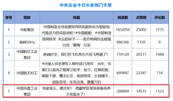 《亮家底儿,晒太阳!西藏军区某装备保养大场面来了!》入选中央企业今日头条热门文章。