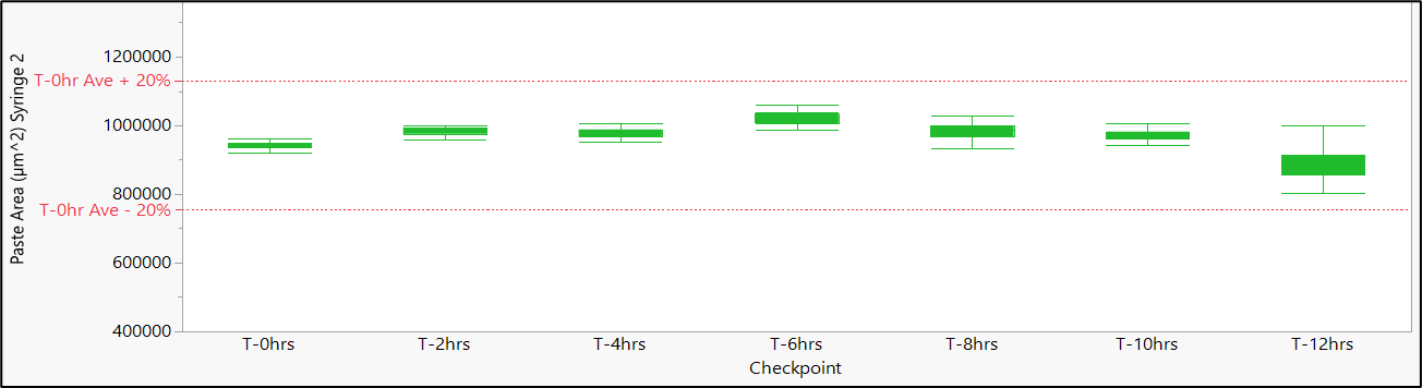 结论:经过连续12小时的点胶操作,图案面积始终保持在规格范围内。此外,整个过程中未出现点胶头堵塞的问题,确保了持续作业的稳定性和效率。