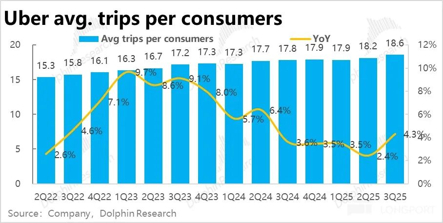 相比之下,Uber eats 外卖业务则是实打实地显著提升,本季订单金额同比增长了约 25%,环比大幅提速 5pct,即便剔除汇率的利好,同样是环比提速 4pct。