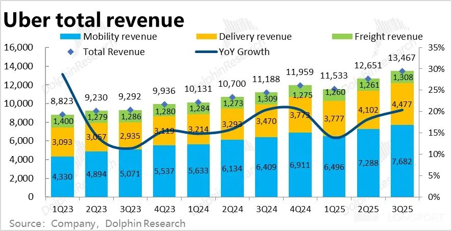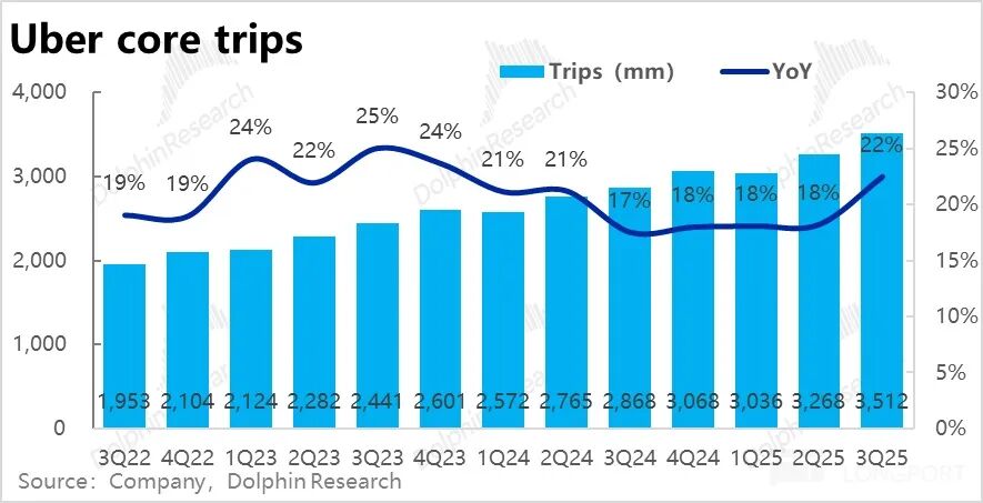 “国际滴滴”优步(UBER.US) 在 11 月 4 日晚美股盘前,发布了 2025 年 3 季度财报,整体来看也属于增长端表现相当出色,加速增长且跑赢预期。利润虽绝对增长不错,但相比高预期略有跑输,且利润率扩张势头明显收窄,详细要点如下: