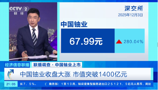 CCTV-2[正点财经]:中国铀业收盘大涨 市值突破1400亿元