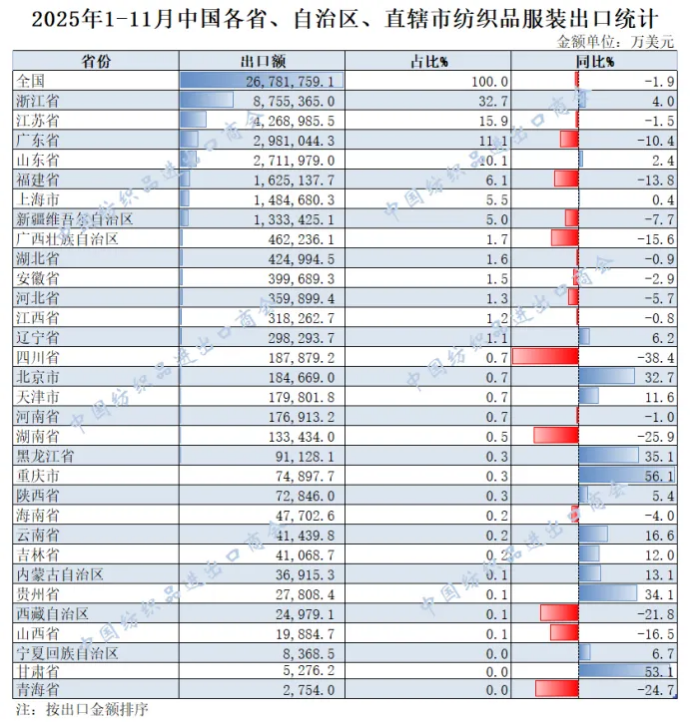 2025年1-11月,我国纺织服装累计出口2678.18亿美元,同比下降1.9%。浙江省、江苏省、广东省、山东省、福建省分别列全国纺织服装出口省市前五位,合计比重超七成。