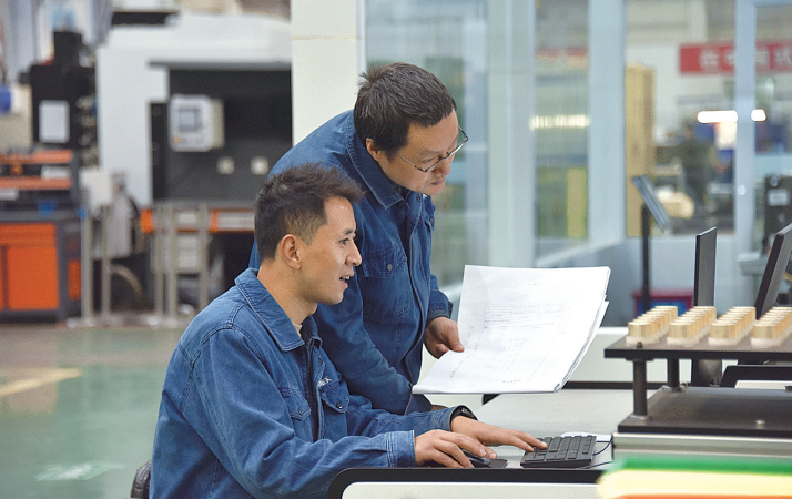 图为车间产线组员工正在调试小回转体单元。梁玲 摄